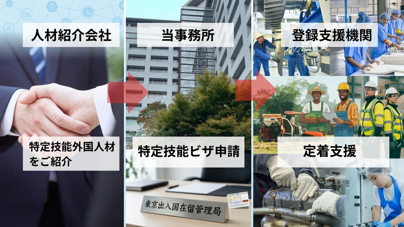 当事務所は、人材紹介会社および登録支援機関と連携し、特定技能外国人材の受入れを検討されている企業様を総合的にサポートしております。