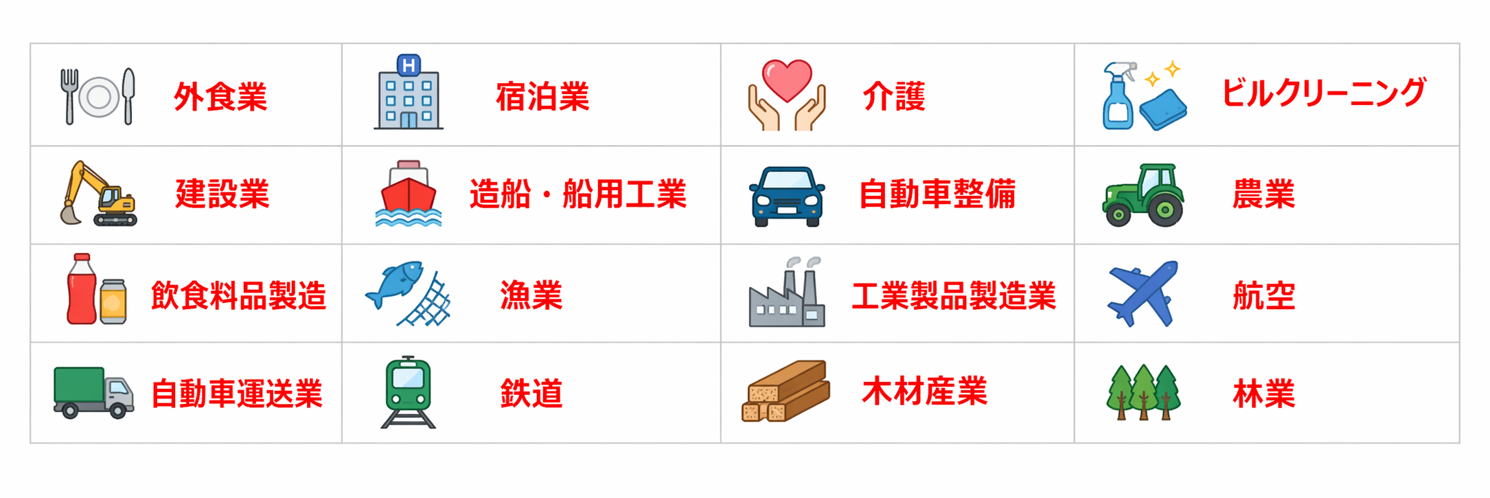 即戦力を有する外国人材を全16分野で受け入れが可能です。