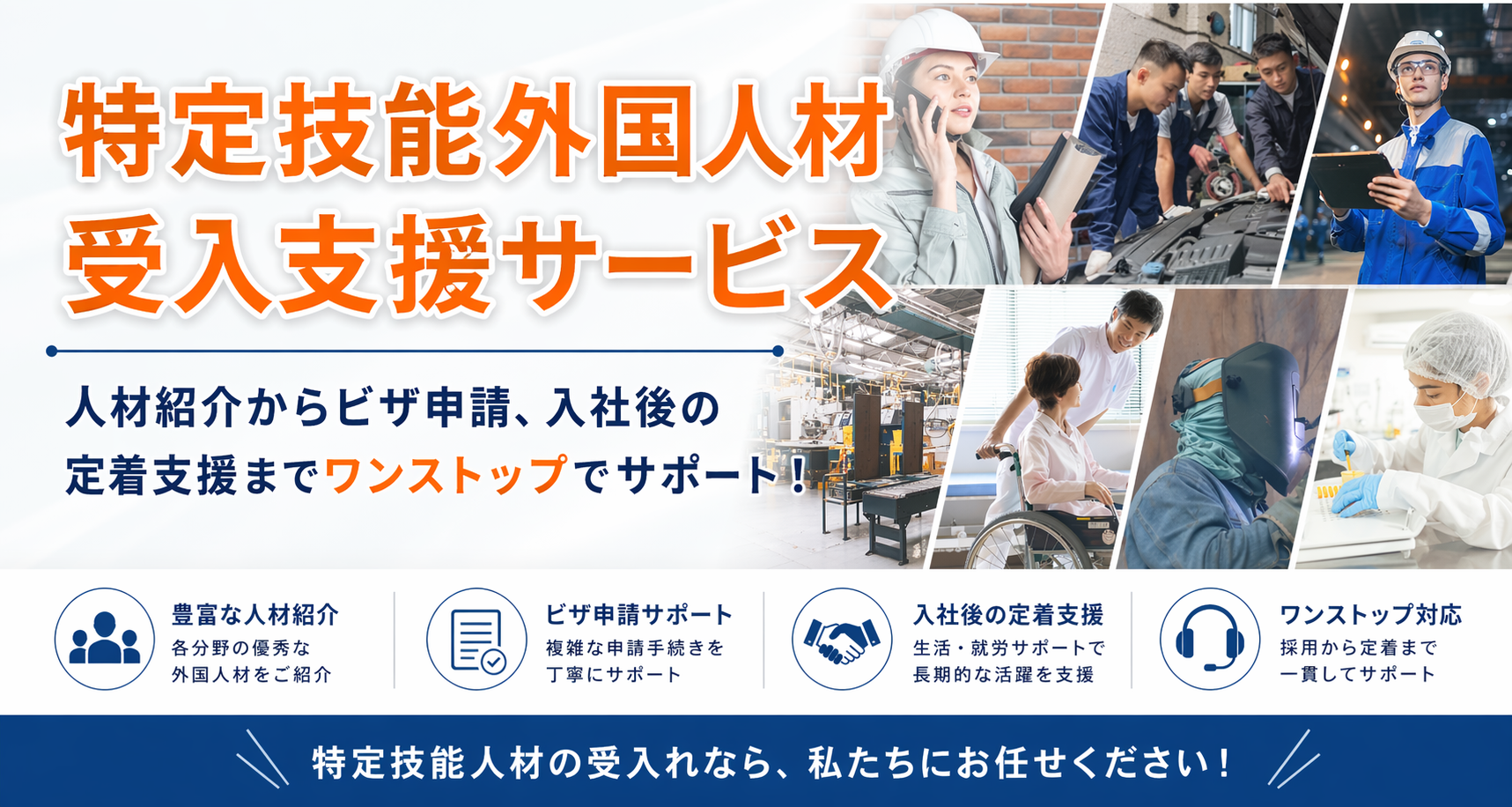 人材のご紹介から特定技能ビザの申請代行はもちろん、支援計画の作成、入管手続き、受入れ後の定着支援まで、すべてワンストップで対応いたします。