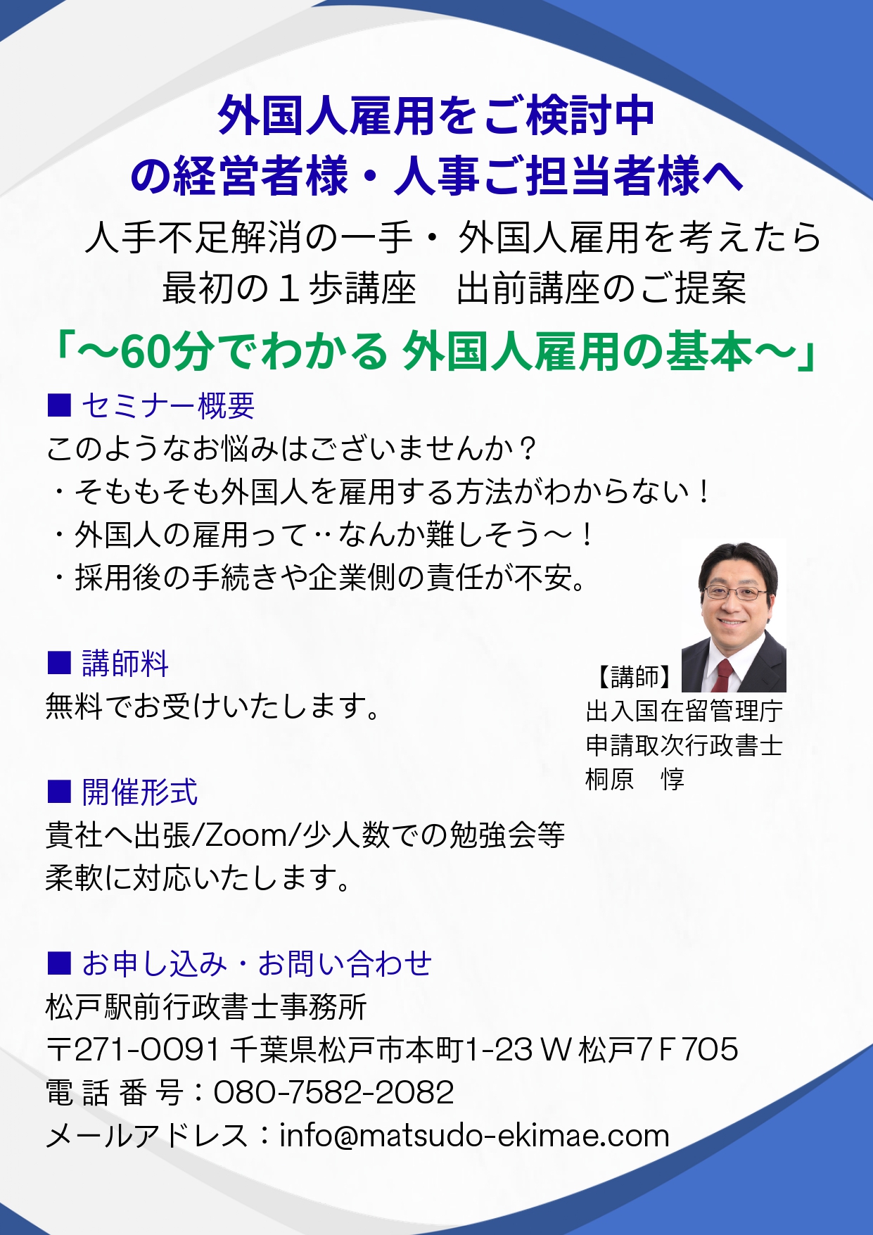 経営者様・人事ご担当者様へ ■ お申し込み・お問い合わせ 本セミナーへのお申し込み・お問い合わせは、当事務所までお電話または、 メールにてご連絡ください。 電 話 番 号:080-7582-2082 メールアドレス:info@matsudo-ekimae.com