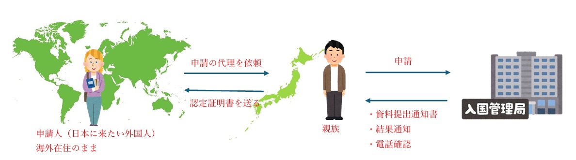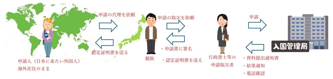 申請人(日本に来たい外国人)が来日せずに申請を行う場合は、必ず日本にいる親族が代理人となる必要があります。これは、行政書士などの専門家に依頼した場合でも同様です。