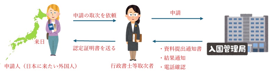 また、本人が一時的に来日して申請を行う場合でも、行政書士などの取次者に依頼することで、申請後すぐに帰国することができます。申請後の入管とのやり取りや郵便対応も取次者が代行できるため、安心して手続きを進めることができます。